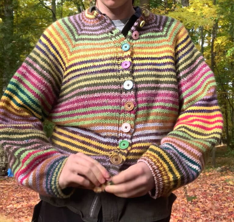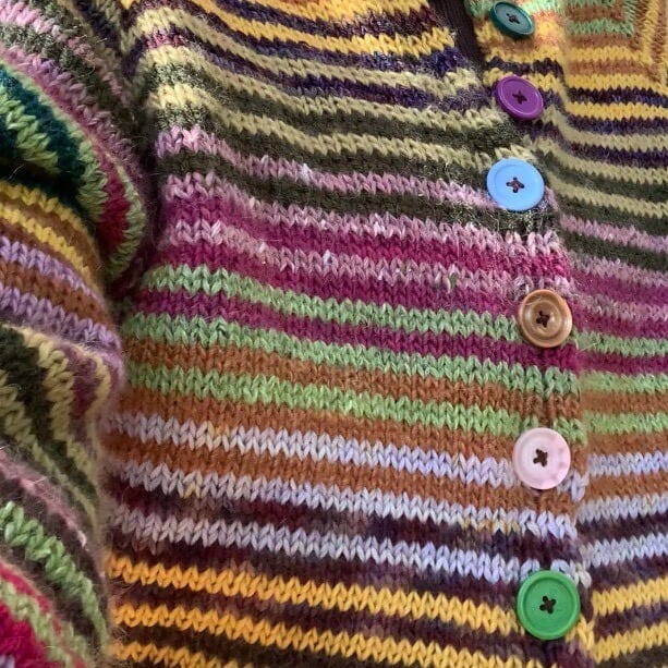 and the project i most recently finished is my scrappy stripey cardigan (pattern by loupystudio), made with my various purple/green/brown yarns, plus some extra funky yarns. i love scrap projects!!!