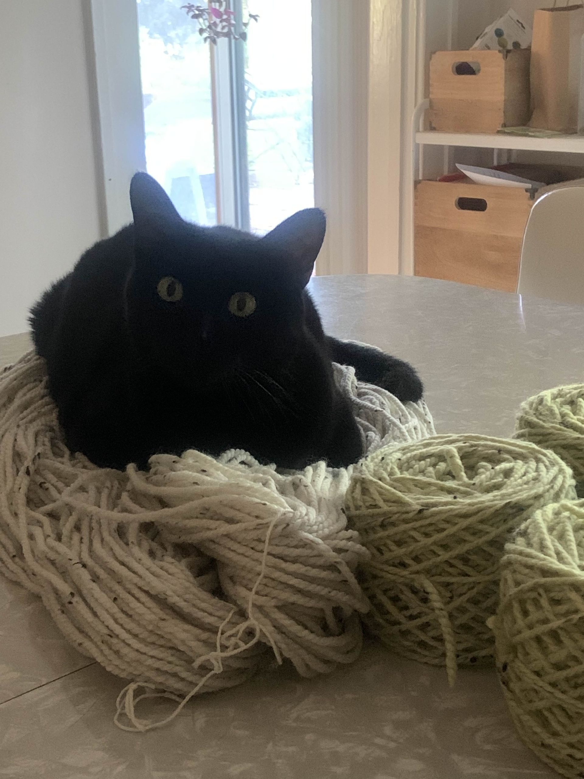 my first time dying wool was a success - and my roommates cat enjoyed it too. i used dharma acid dye, specifically a diluted mix of chartreuse and lichen, on Plymouth Yarn Hearty Homestead Tweed in their natural undyed colorway