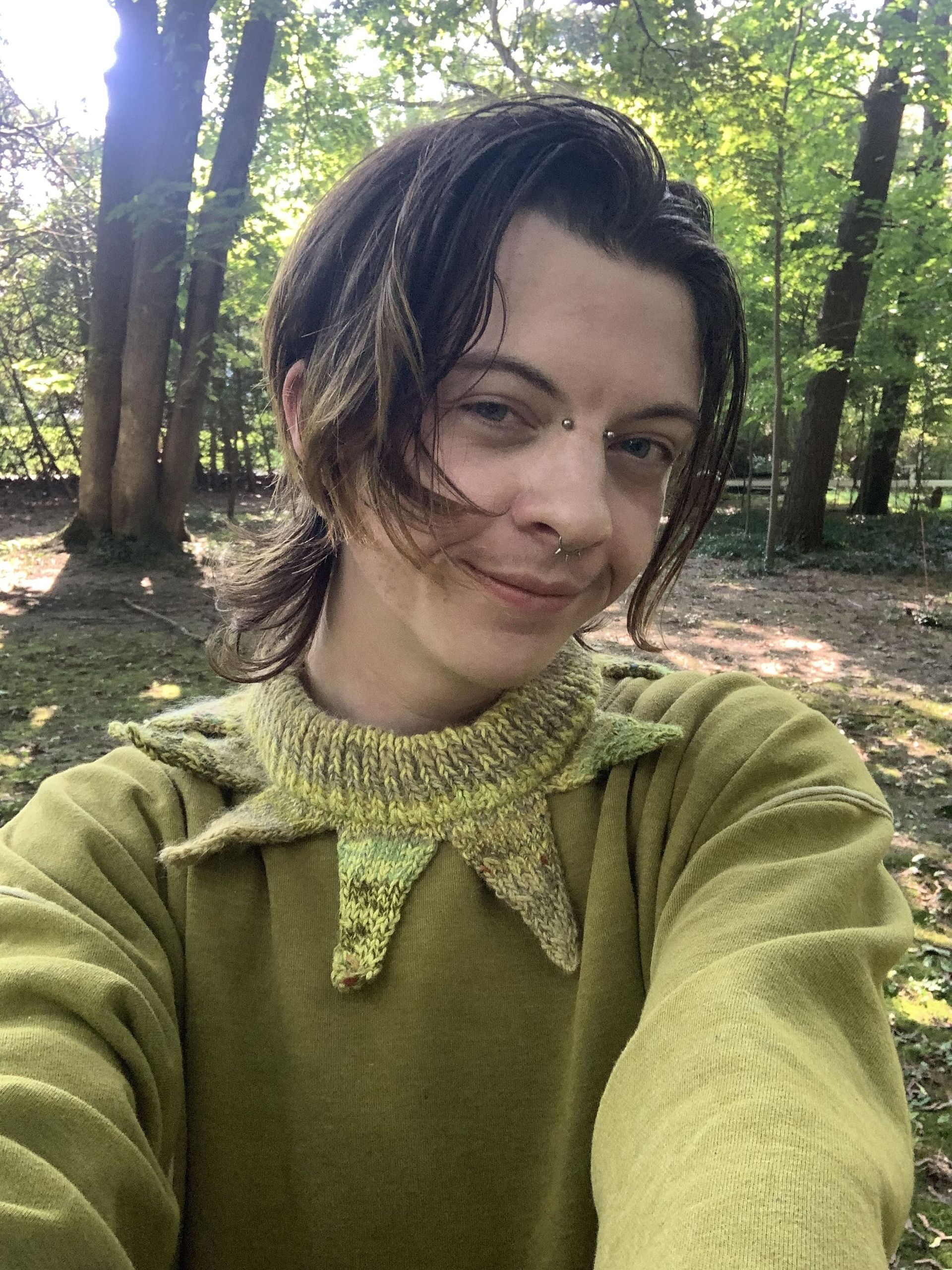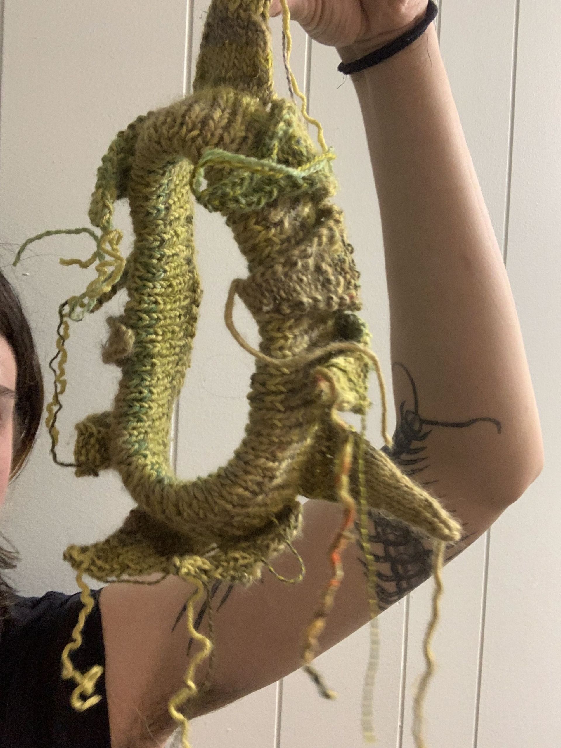 a scrap yarn kermit collar with my amassed collection of light green yarn (pattern by nonbin crafts)
